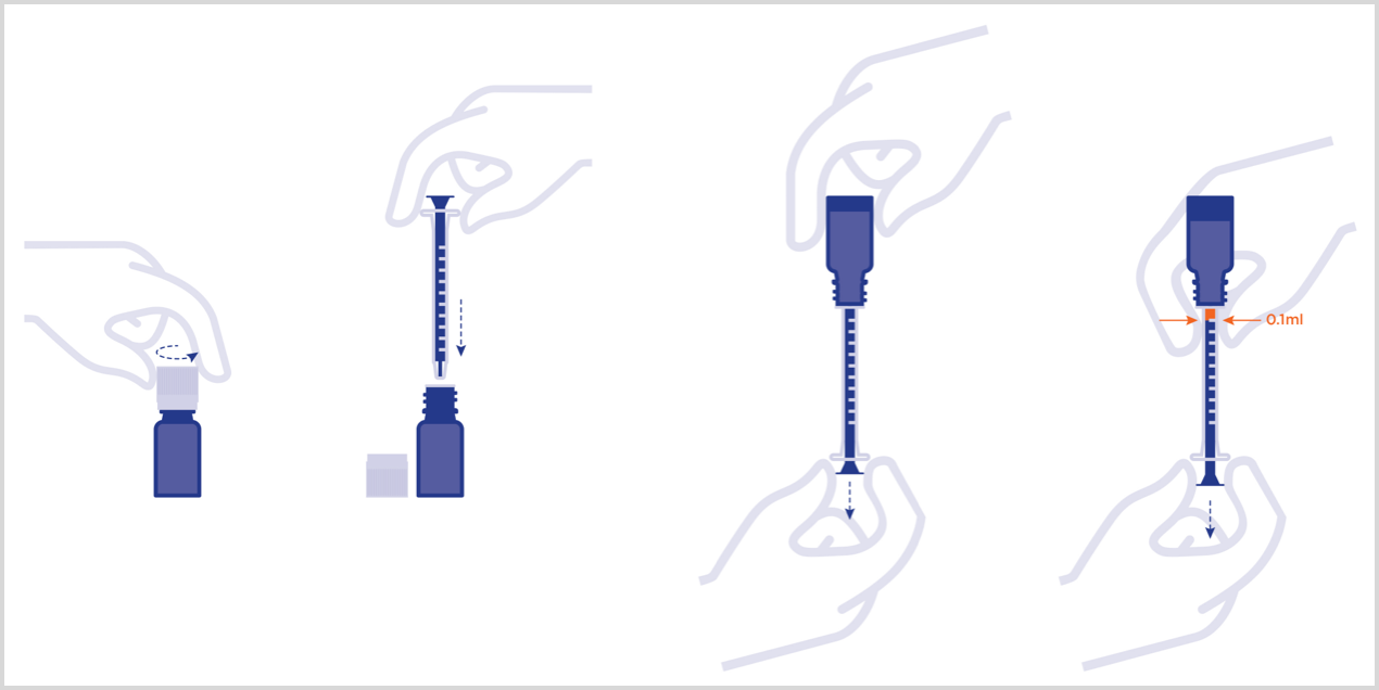 i flaskans hals. - 2För att fylla dossprutan, vänd flaskan upp och ner. Medan du håller dossprutan på plats, dra försiktigt ned kolven och dra upp vätskan till rätt dos i dossprutan.
