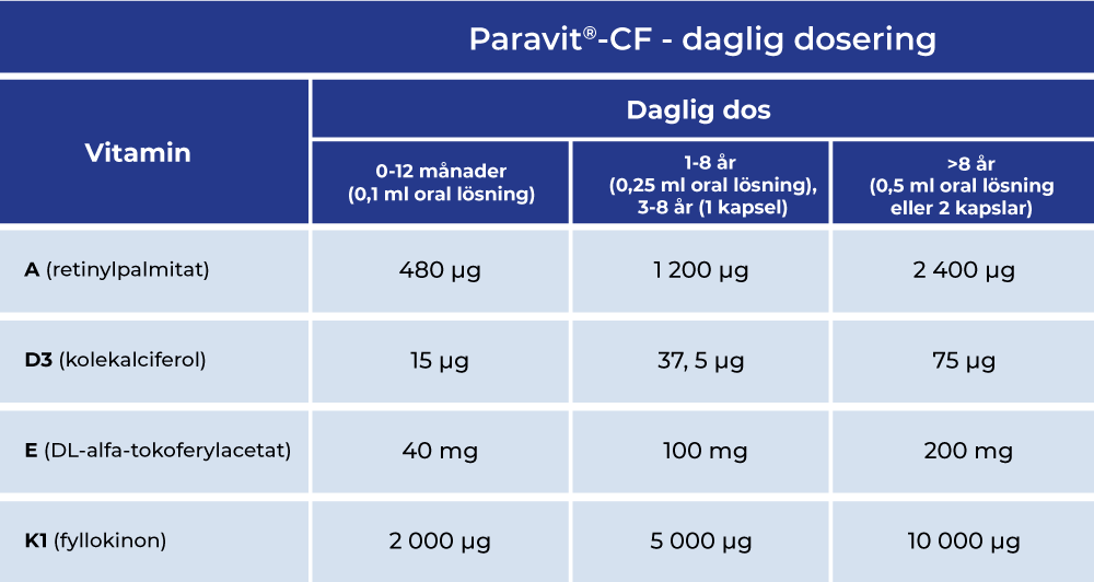 Den rekommenderade dagliga dosen av Paravit®-CF baseras på återkoppling från vårdpersonal om tillskott av fettlösliga vitaminer. Daglig dosering av Paravit-CF följer europeiska riktlinjer (ESPEN 2016).